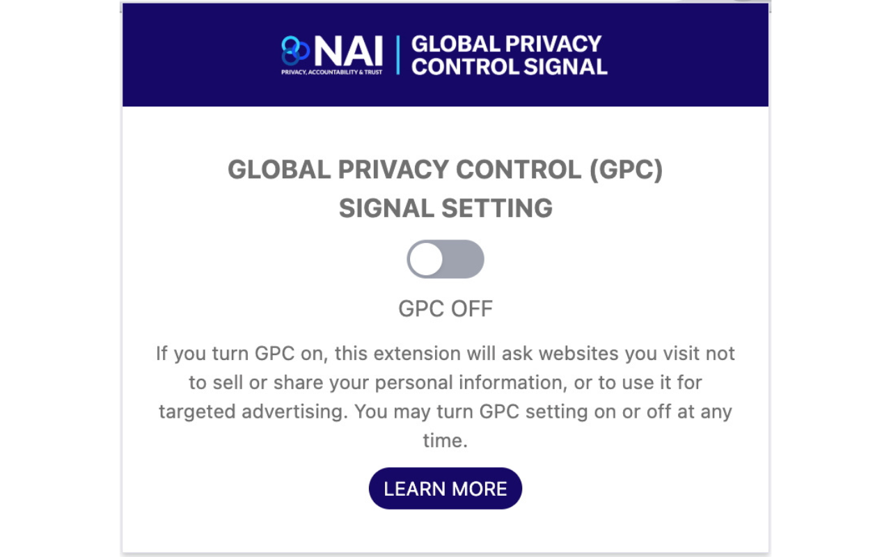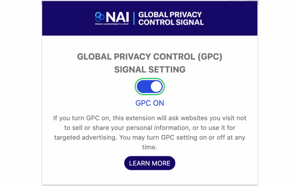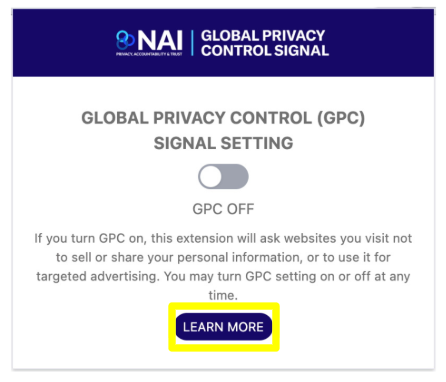 The NAI Global Privacy Control Signal browser extension is designed with usability for consumers at the forefront. Once downloaded from the Chrome Web Store, the extension appears in the browser toolbar and presents users with a simple on/off toggle. It provides a clear, succinct explanation of what the signal will communicate to websites. When the extension is enabled, and the GPC signal is turned on by the consumer, it sends the GPC signal via the HTTP header to every website the user visits, indicating the user’s request to opt out of targeted advertising and the sale of personal data. This approach allows consumers to express a persistent, global opt-out preference without relying on individual website interfaces or registration-based systems.